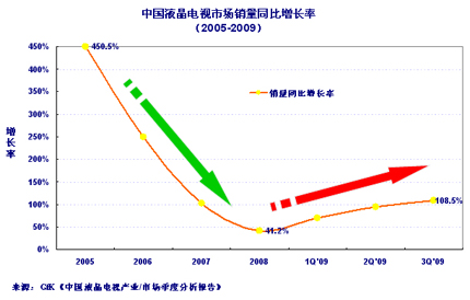 2009年,中國液晶電視市場的第一亮點就是增長速度戲劇性反彈。說增速戲劇性反彈,是因為2009年中國液晶電視的表現出乎大家預料。從2005年開始,雖然中國液晶電視市場規模一直在擴大,但增長速度卻年年縮小,2005年,中國液晶電視市場銷售規模的增速為450%,隨后基本上是每年減少一半,到2008年,增速已經下降到41%。2008年4季度,全球性經濟危機沖擊中國,所以業界對2009年中國液晶電視市場的預計基本是規模繼續擴大,增速進一步遞減,預計市場規模增速大約在20~30%之間。