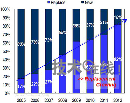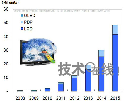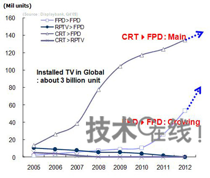 替代需求持續增加,2008~2009年占到了半數以上,估計2010年將達到所有FPD電視需求的63%,推動市場不斷擴大。