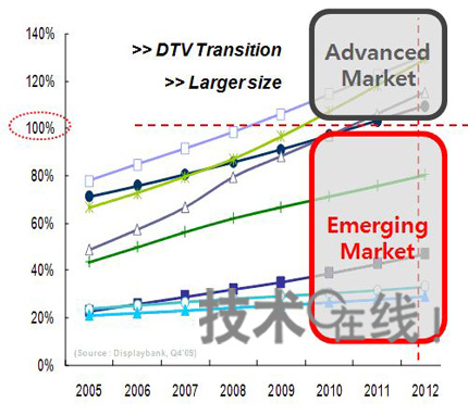 如下圖所示,在發達市場國家(圖中的Advanced Market),向數字電視的過渡以及替代CRT電視已得到順利推進,FPD電視進入飽和狀態。