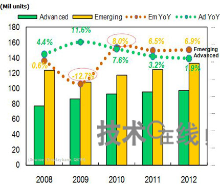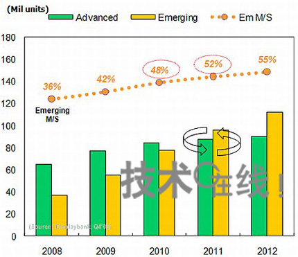 2009年新興市場國家的電視總供貨量比2008年減少12.7%。原因是液晶電視的價格仍很高。不過,新興市場國家的液晶電視需求在2009年下半年出現增加,預計2010年該市場的電視總供貨量將比2009年增加8.0%。