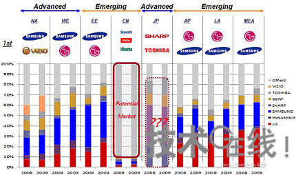 從按照廠商劃分的各市場的電視份額來看,在大部分地區都是韓國三星電子和LG電子占據優勢。但中國市場的情況不同,這些全球頂級廠商的勢力較弱,而中國本土廠商則十分強勢。中國市場雖然存在較大的價格障礙,但已逐漸顯露出液晶電視最大需方的趨勢,對全球大廠商而言,有望成為新的增長市場。