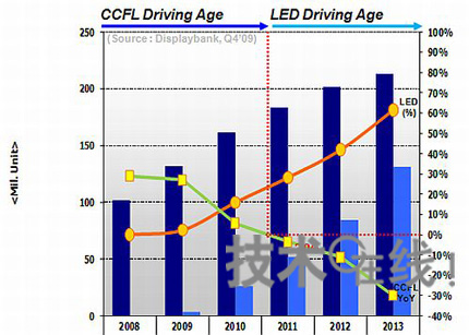 2009年LED背照燈液晶電視(LED TV)市場規模為360萬臺,2010年將迅速擴大至3200萬臺,這相當于整個液晶電視市場的19%,估計LED背照燈液晶電視時代將由此到來。使用CCFL(冷陰極射線管)背照燈的液晶電視預計在2011年以后出現負增長。今后,LED背照燈液晶電視將承擔起推動背照燈液晶電視增長的角色。