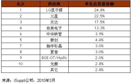 iSuppli公司對(duì)1月份全球10大大尺寸(大于或等于10英寸)液晶面板制造商的排名