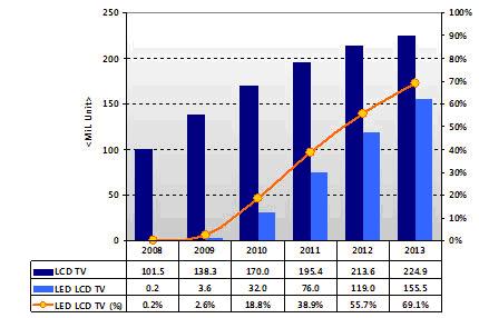 今年液晶電視業界為能夠熱銷LED液晶電視來推動營收,將LED液晶電視高價精品的定位改為大眾化中檔的產品。且以更輕薄的外觀與環保概念推出LED液晶電視,期能達到產品差異化、價值創造及高附加價值。據Displaybank分析,預計2013年時,LED液晶電視銷售量將達1.56億臺,且占全部液晶電視的比重也將攀升到七成(69%)。LED液晶電視市場從2008年至2013年五年中,年平均成長率將會以272%的速度往上攀升。