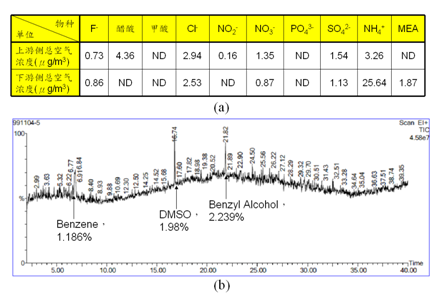 我們被通知,并被要求試著分析圖 1中 (b)圖的可能成份。實驗室開始動員,利用超純水萃取擦拭物后,并以離子色譜儀分析無機物的組成;同時,也利用自動熱脫附儀,搭配氣相色譜質譜儀分析有機物的組成。