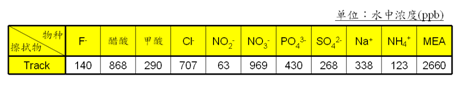 純水溶出物中,有醋酸、銨、硫酸根等都不奇怪,比較有意思的,是有MEA。這一點和前述的化學過濾器量測結果相吻合。