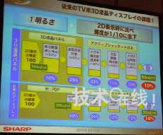 夏普于2010年4月12日公布了開發出的支持三維(3D)顯示的電視機液晶顯示器(圖1,圖2)。作為電視用3D顯示器,“實現了業界最高的100cd/m2以上的亮度”(該公司常務執行董事兼研究開發總部長水嶋繁光)。并表示,比其他公司更好地抑制了左眼和右眼用影像重疊時的“串擾”現象的發生。配備了開發品的3D電視計劃于“2010年5月發布,投入夏季商戰”(該公司副社長執行董事、AV系統業務主管松本雅史)。對開發品在夏普液晶電視“AQUOS”中所占的供貨比例,松本自信地說:“目標是達到5~10%”。據悉,目前新產品預定只配備于AQUOS,外售計劃未定。