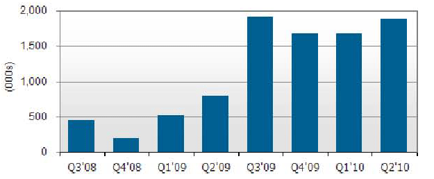 圖一 : 從Q3’08到Q2’10應用于電子書電子紙出貨量 (單位 :千片)