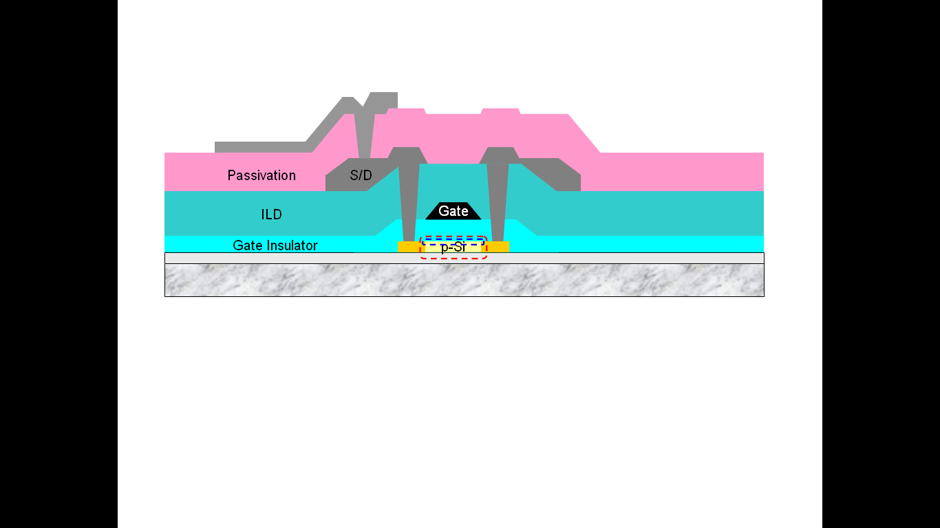 圖 1的是為LTPS組件的構造簡圖。而圖 1中的紅色及藍色虛線為LTPS組件,對日后電性表現最為重要的區域。