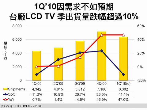 2009年第四季,液晶電視(LCD TV)業(yè)者為達年度目標,以大幅降價進行促銷活動,使得當季臺廠液晶電視出貨量顯著成長;然根據(jù)DIGITIMES Research觀察,2010年第一季因歐美市場對液晶電視需求轉弱,加上中國大陸農(nóng)歷年節(jié)銷量不如預期,使得通路庫存升高,導致品牌及通路業(yè)者向臺系統(tǒng)廠拉貨力道減弱。