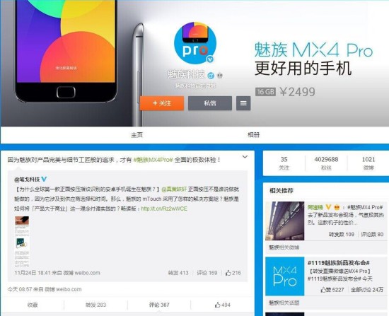 圖:筆戈科技發表長微博闡述成為首款正面按壓式指紋識別安卓機的緣由。