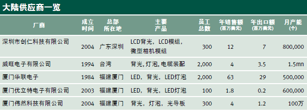 在中國大陸建廠的臺灣、韓國和日本供應(yīng)商,包括中強光電、Radiant和K-Bridge,加劇了競爭。但這些外資企業(yè)目前專注于筆記本、監(jiān)視器和液晶電視背光,使得小尺寸面板背光領(lǐng)域的競爭更加公平。