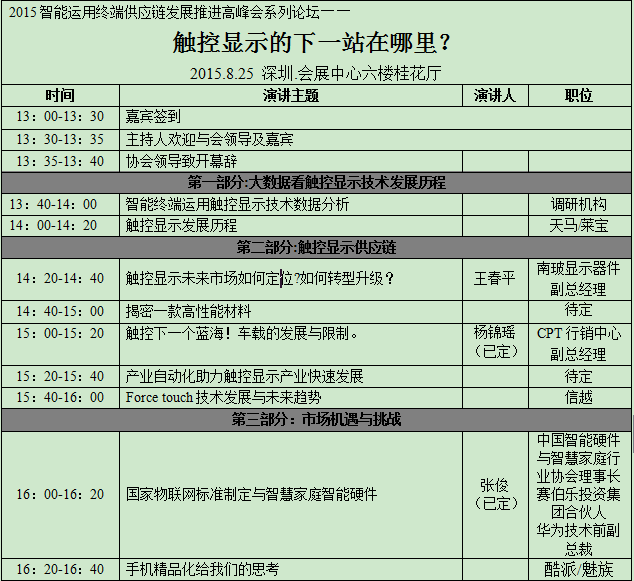 當(dāng)下智能運(yùn)用市場(chǎng)的蓬勃發(fā)展,如:智能手機(jī)調(diào)整戰(zhàn)略瞄準(zhǔn)精品化路線,車載市場(chǎng)大量導(dǎo)入電容觸控技術(shù),智能穿戴產(chǎn)品也是層出不窮,“互聯(lián)網(wǎng)+”智慧生活,更是把智能家居概念帶入到了大家的視野,對(duì)觸控顯示廠家來說是機(jī)遇,是挑戰(zhàn)?一個(gè)好的產(chǎn)品勢(shì)必需要一個(gè)好的上游配套供應(yīng)鏈,這是否會(huì)促使觸控顯示產(chǎn)業(yè)進(jìn)行格局劃分?此次論壇將邀請(qǐng)智能手機(jī)、智能家居、車載、觸控顯示大伽共同探討如何推動(dòng)產(chǎn)業(yè)的發(fā)展?