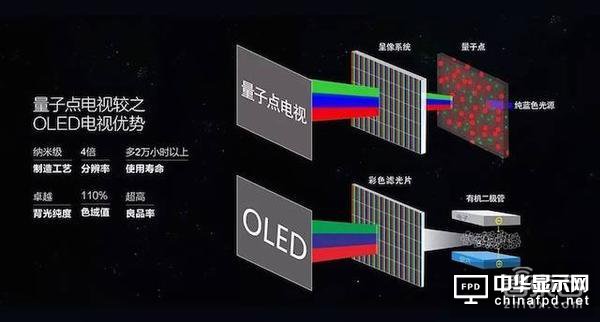 采用量子點材料的電視呢,比起OLED 電視,它有著更寬廣的色域顯示、更精準的色彩控制、更長的使用壽命,是下一代電視的發展方向。