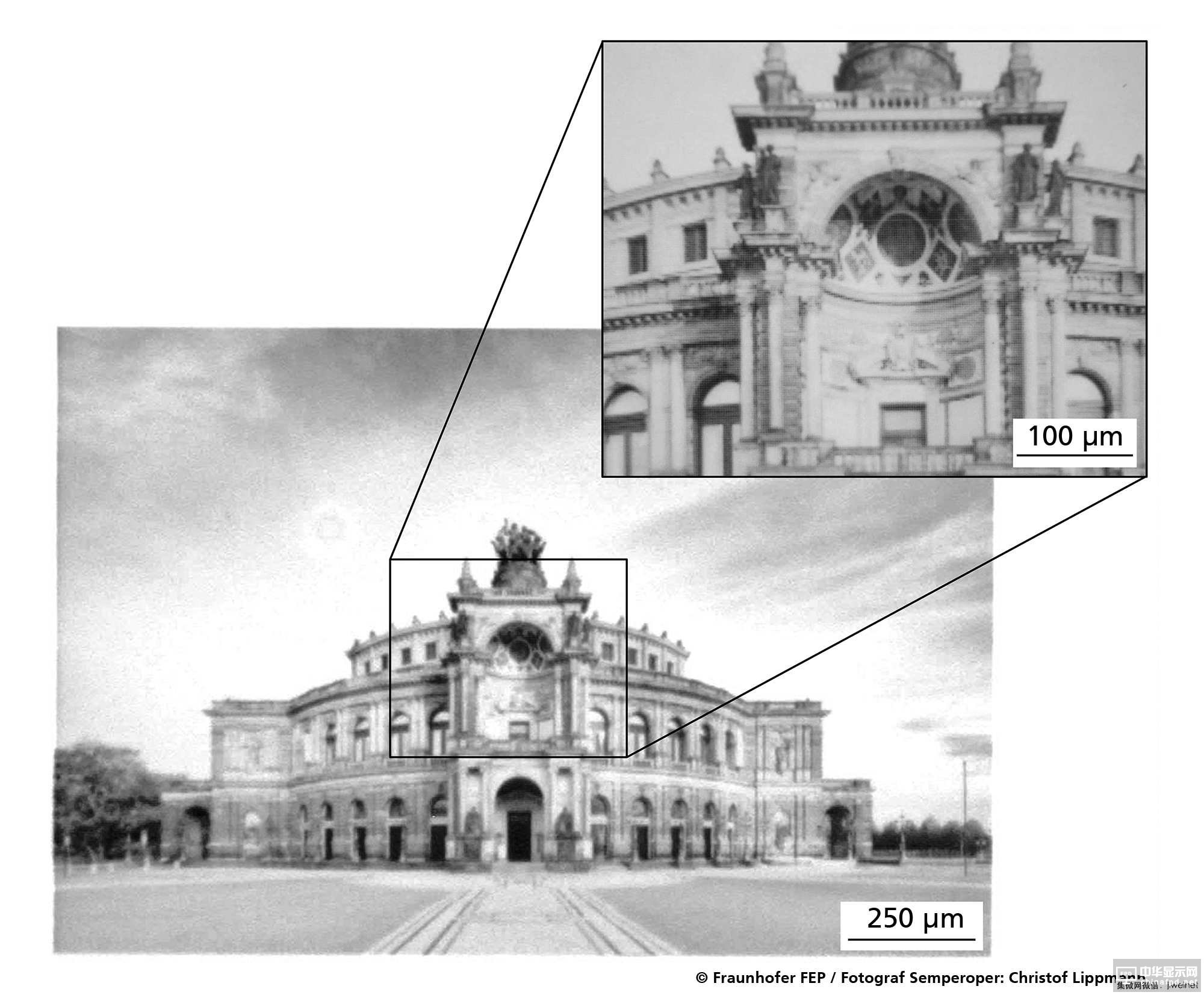 以電子束制作的Dresden Semperoper歌劇院灰階OLED圖 (制圖:A. Rudzinski, Raith GmbH、Fraunhofer FEP / 攝影:Jurgen Losel)