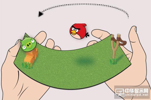 壓彎屏幕表示拉彈弓,當(dāng)你松手放開彈弓時(shí),小鳥就像是直接從屏幕中飛出去一樣。