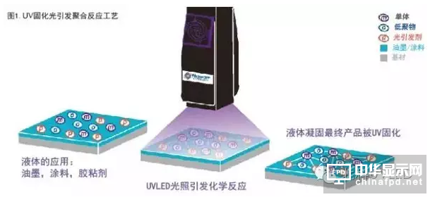 紫外光固化是利用UV能量使液體變為固體的光聚合過程。依靠吸收UV能量,光引發劑(PI)的自由基引發膠粘劑(單體和聚合物)的交聯反應,在這個聚合反應中油墨,涂料或膠粘劑通常幾秒就能夠固化或凝固(見圖1)。