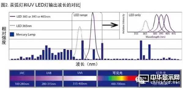 UV固化的LED以一種完全與眾不同的方式產生UV能量。當電流(電子)穿過名為二極管的半導體裝置時,它以量子形式放射出能量。二極管中的特殊材料確定了這些量子的波長。在紫外發光二極管中,能量輸很典型地處于一個非常狹窄的頻帶內(±10納米)。圖2比較了395納米UVLED燈和標準汞弧燈。一個非常重要的發現就是兩者的輸出強度和波長都不一樣,這種差異對于理解UV固化過程很有意義。