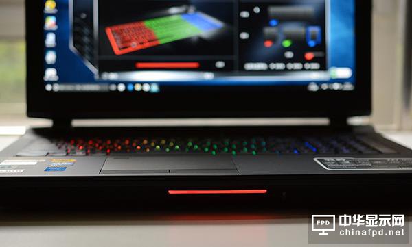 C面是全彩的孤島式游戲鍵盤,104鍵手感確實很棒,鍵程短適合長時間使用。而多彩背光可以根據筆記本自帶的軟件進行調節,還有呼吸燈效果。