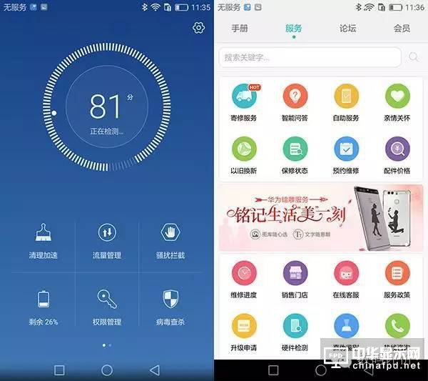 手機管家、手機服務是兩個很重要的APP,前者維護系統的性能和安全,后者為手機直接提供售后支持,有問題不需要再往維修中心跑。