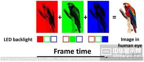 之前三星利用克爾效應,讓藍相液晶發出紅、綠、藍光,然后根據所需要的顏色,在10倍于普通液晶的響應時間里讓像素快速閃爍,直接混合紅、綠、藍三種色彩。吳詩聰團隊的方案據說是使用了紅、綠、藍三種LED背光燈,在亞毫秒級的響應時間里進行快速切換。由于閃爍時間極為迅速,肉眼無法捕捉,因此我們看到的直接就是混合后的色彩,而非普通電視那樣間接混合RGB三色。