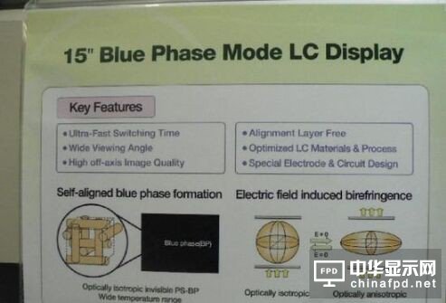 世界上第一款藍相液晶面板由三星于2008年推出,基于藍相液晶的技術特點,這塊面板達到了240Hz的高刷新率,但同時存在著需要高電壓、發熱量大以及顯示對比度低的缺點。