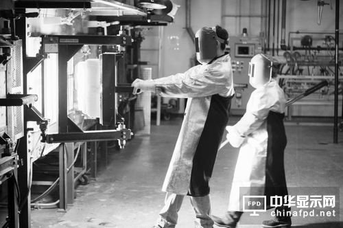 美國紐約州北部的康寧公司總部研究室內,三名戴著巨型面具、身著太空服般銀色工作服的工程師正在科研熔爐旁進行新材料的研制。他們不得不面對溫度高達1600攝氏度的熔爐,手抓用以熔融玻璃的白熾坩堝,快速倒出高溫液體材料,并在液體硬化前將之塑造成他們想要的形狀。