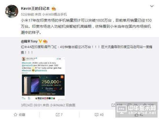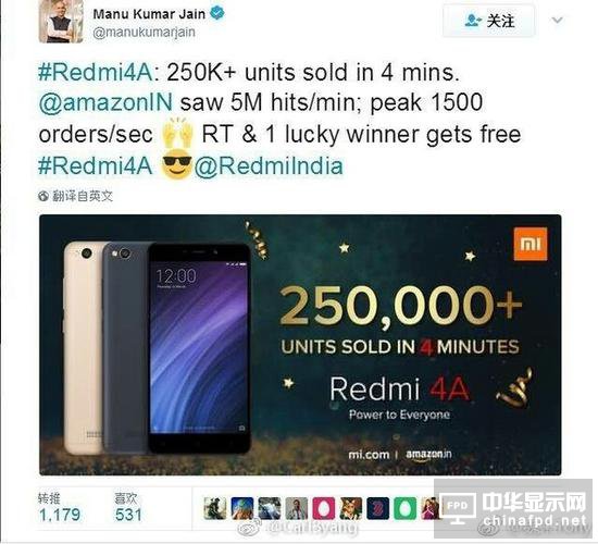 前幾天,新晉小米全球副總裁Manu Kumar Jain在推特中宣布,紅米4A銷量在印度取得開門紅,開售僅4分鐘便賣出超過25萬臺,不僅如此,瞬間涌入亞馬遜網站的購買者帶來了巨大的流量,甚至一度導致印度亞馬遜網站癱瘓。