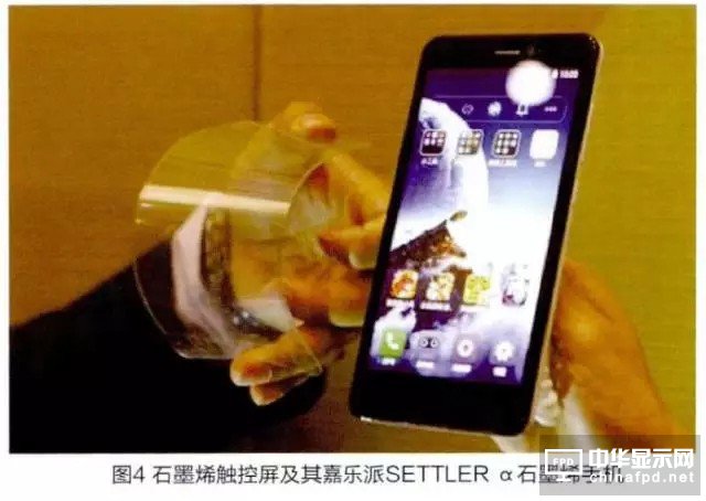2010年, 韓國三星公司最早將石墨烯膜作為透明電極應用于3.1英寸電阻觸控屏,在國內, 中科院重慶研究院致力于石墨烯薄膜的大面積制備與應用技術研究, 2013年1月發布了國內首片15 英寸單層石墨烯薄膜, 并制備了7英寸柔性墨烯電阻式觸控屏。圖2 所示, 該石墨烯觸控屏色質純凈、透光性好、觸控靈敏, 特別是在彎曲的情況下同樣可以實現良好的觸控和書寫。這種隨意卷曲也不會影響使用效果的觸摸屏將促進柔性智能終端的開發。