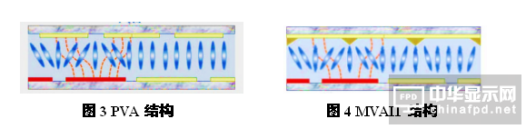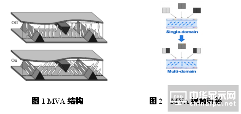 1997年富士通提出了MVA的結構,如圖1所示,在陣列和彩膜基板的兩側做出凸起結構。在初始狀態時,液晶分子垂直于凸起表面和基板表面排列,當施加電壓以后,液晶分子沿著電場線的方向進行排列。因為子像素被分成多個凸起的區域,因此在子像素中形成了多疇,也就是如圖2所示的多視角顯示。VA技術的優勢被開發出來,是VA模式重要的里程碑。