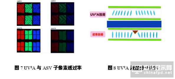 在2006年,日本夏普提出并開發了UV2A的顯示技術,如圖6所示,使用光配向技術,對彩膜和陣列基板兩側的配向膜進行紫外光配向,形成多疇結構。初始狀態時,液晶分子以一定角度排列,當施加電壓以后,液晶分子會按配向的角度進行轉動,從而使光線從液晶面板中透過。