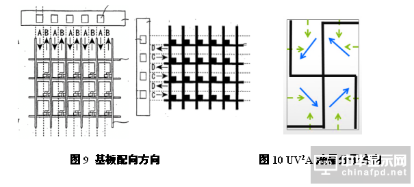 如圖9所示,分別對CF和ARRAY側的一半子像素的PI進行曝光,同一子像素內形成不同的配向方向,CF和ARRAY側基板的配向方向需要旋轉90度。G6因為基板尺寸較小,所以,需要的UV MASK數量較少。最終如圖10所示,液晶分子形成一定的配向角度,并因邊緣、配向不同區域出現一定黑紋。