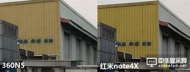 畫面中央?yún)^(qū)域則主要是銳度上的區(qū)別,畢竟顏色上千名說過了。具體而言兩邊都有過度銳化造成的白邊問題,程度也差不多,不過看黃色招牌的豎紋、藍色的文字以及左邊的白色柵欄,顯然Note4X要比N5的銳化更有成效。