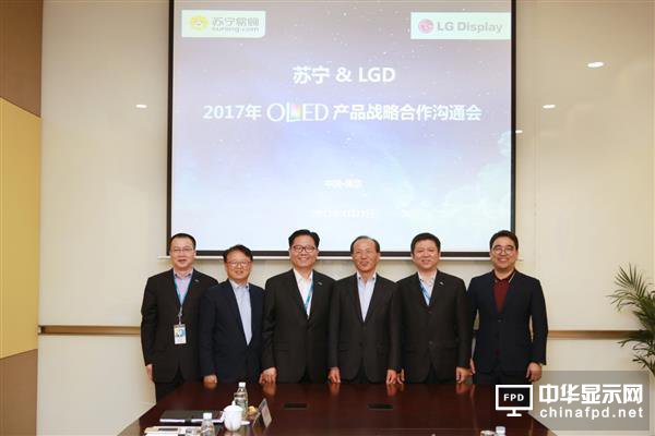4月20日,LG Display社長呂相德攜高管團隊現身蘇寧總部,與蘇寧云商高層團隊就2017年OLED推廣戰略合作展開會談,并敲定在北京慈云寺蘇寧云店中,建設全球最先進也是中國唯一一家OLED創新技術體驗館。