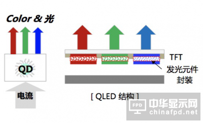 國際上對QLED的真正定義是QuantumDotLightEmittingDiodes,即量子點發光二極管,或量子點自發光顯示技術,也被稱為電致發光量子點。真正的QLED是不需要額外光源的自發光技術,其原理是量子點層夾在電子傳輸和空穴傳輸有機材料層之間,外加電場使電子和空穴移動到量子點層中,它們在這里被捕獲到量子點層并且重組,從而發射光子。但是量子點因其容易受熱量和水分影響的缺點,無法實現蒸鍍方式,只能研發噴墨印刷制程。所以,受限于當前材料和技術,尚未出現真正的可以實現自發光的QLED電視。