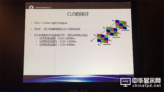 光峰研究了大多數(shù)傳統(tǒng)激光顯示系統(tǒng),包括光峰ALPD技術(shù)和競爭對手的產(chǎn)品。這些產(chǎn)品最大的色彩劣勢呈現(xiàn)在兩個方面:首先是CLO(色彩亮度)亮度水平低于標(biāo)稱值,這實際導(dǎo)致系統(tǒng)參數(shù)很漂亮,但在高色彩顯示的時候系統(tǒng)難以達(dá)到標(biāo)稱亮度效果。第二,傳統(tǒng)激光顯示中白色畫面紅光色段能量占比只有10左右,稍高一些達(dá)到13%,這遠(yuǎn)不能滿足高效色彩顯示中紅光能量占比的需求。