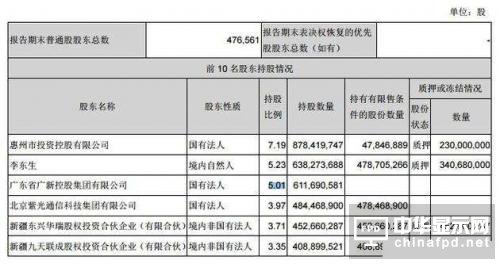 此外,TCL集團也披露了公司前十名股東的持股情況。其中,惠州市投資控股有限公司持股878,419,747,占比7.19%;李東生持股638,273,688,占比5.23%;廣東省廣新控股集團有限公司持股611,690,581,占比5.01%。