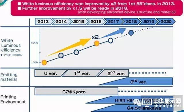 對于器件的亮度,JOLED以其2013年時做到的值為基準(一倍),今年已經做到了兩倍,預計2018年可以做到三倍。目前打印技術的研究所在京都,但從2016年開始轉移到石川縣,在那里建立一條4.5代(730mm×920mm)量產線,用于300PPI以上精細度打印OLED面板的量產。