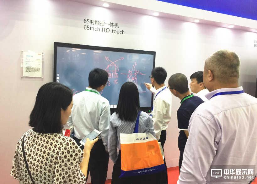 展會上,康得新展示了大尺寸65吋觸控一體機,這款產品隨心書寫,無比流暢,只需把手指放在觸控顯示屏幕上進行多點觸摸,即可享受書寫、編輯、標注、截圖、一鍵輸出等功能,是教學演示、師生互動的最佳選擇,參觀者爭相體驗操作。