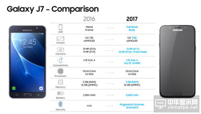 由于市場定位的緣故,三星News J系列在觸控屏規格上略有差異。其中,J5(2017)配有5.2英寸720p的SAMOLED顯示屏,而J7(2017)則裝載有5.5英寸1080p的SAMOLED顯示屏。同時兩款新機還升級了網絡連接功能,均支持LTE Cat 6,VoLTE和VoWiFi等功能。