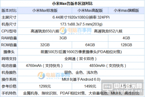 而上一代小米Max版本相對(duì)較多,包含了三個(gè)版本,包括標(biāo)準(zhǔn)版、高配版和旗艦版,各版本差異也相對(duì)復(fù)雜一些,主要是處理器、內(nèi)存、存儲(chǔ)、價(jià)格四個(gè)方面的區(qū)別,具體區(qū)別如下圖所示。