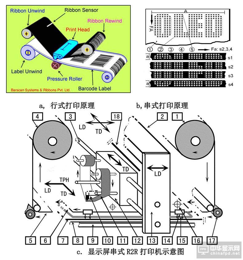 a、行式打印原理:最常見的如同超市條碼打印機(jī),熱敏頭寬度即打印寬度;條碼串(打印長度即紙帶任意長度)即行打串。圖中采用TTR色帶的數(shù)碼熱轉(zhuǎn)印。STPD技術(shù)是把顯示屏發(fā)光材料、電極材料、傳輸材料、絕緣材料等制成油墨、由這種色帶串式R2R打印顯示屏。這種油墨可以包容無機(jī)物、不溶性有機(jī)物。