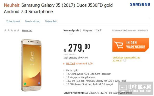 盡管三星尚未正式發(fā)布New J系列新機(jī),但此前已有真機(jī)亮相的三星GALAXY J5(2017)現(xiàn)在已經(jīng)登陸德國(guó)在線銷售商Cyberport網(wǎng)站,并給出了6月22日開(kāi)賣的消息。盡管現(xiàn)在還不能百分百確定這將是三星New J系列在歐洲的發(fā)售時(shí)間,但相信應(yīng)該不會(huì)離的太遠(yuǎn),也就是也將在本月底登陸歐洲市場(chǎng)。