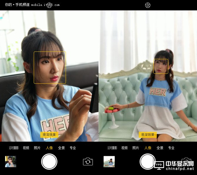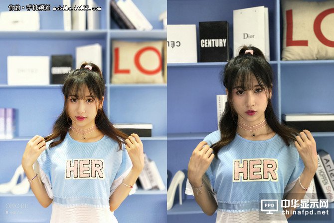 這是一個以地中海色調涂刷的房間,除了頂上好幾個大功率日光燈,旁邊還有好幾扇大窗戶,因此光線很明亮。這也是OPPO R11和iPhone 7 Plus人像模式對比的第一個場景,看到樣張的時候小編還是比較震驚的。可以看到OPPO R11整體畫面更明亮,確實一鍵完成了“美顏+智能曝光+背景虛化+膚色調節”;相比之下iPhone 7 Plus也對人臉進行了捕捉,但僅僅是判斷景深,并沒有進行相應的曝光補償、膚質優化。