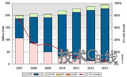 圖1:按照全球不同電視技術進行的需求預測(銷量)源自DisplaySearch的“季刊全球TV供貨調量報告”