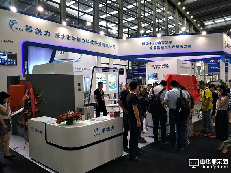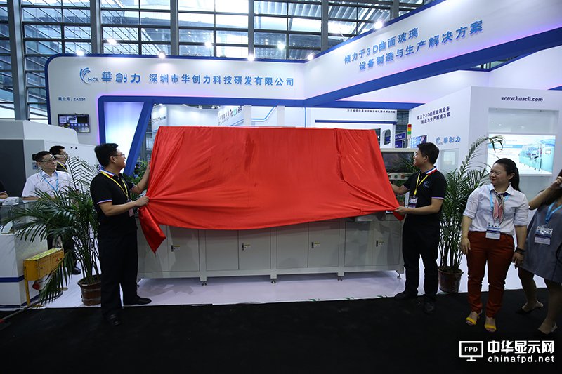 在華創(chuàng)力公司展位上,副總經(jīng)理覃云勝與總工程師周煒為新型曲面玻璃熱壓成型機揭幕,現(xiàn)場十多家媒體以及數(shù)十位業(yè)界人士共同見證了揭幕儀式。