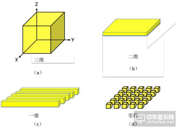 傳統一般尺寸的材料我們稱為「塊材(Bulk)」,其結構是在三維空間中的X軸、Y軸、Z軸都可以無限延伸,如圖一(a)所示,而納米材料可以簡單地由外觀的幾何結構分為二維、一維、零維等三種: