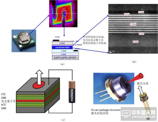 圖四(c)為使用多層量子井結構所制作的「量子井激光二極管(Quantum well laser diode)」,科學家稱為「垂直共振腔面射型激光(VCSEL:Vertical Cavity Surface Emitting Laser)」,是目前已經量產的商品,外觀如圖四(d)所示,這種結構普遍應用在光通訊的光源。