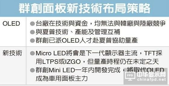 群創技術開發中心負責人丁景隆表示,確信Micro LED將是下一代顯示器技術主流,然而尚待解決數百萬顆以上Micro LED巨量移轉的問題。 因此,群創已投入次毫米發光二極管Mini LED技術開發,獲得各車廠的關注。 Mini LED搭配軟性基板的應用,被視為取代OLED成為車用面板的最佳選擇。