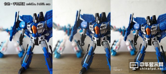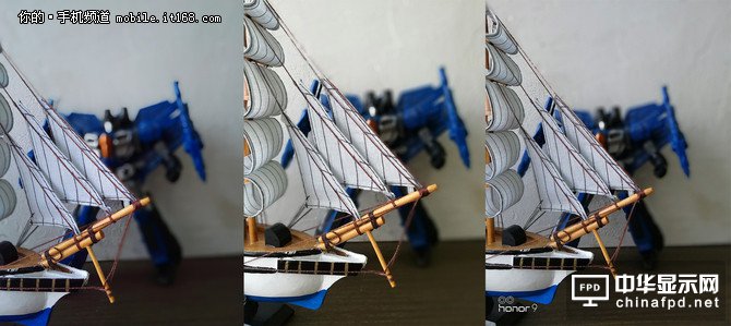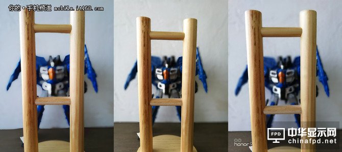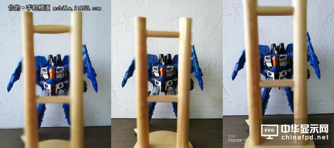 可以看到,雖然兩個物體之間的距離已經足夠遠,但采用第一代技術的榮耀6plus已經出現過度虛化的問題,而榮耀8與榮耀9則可以區分出前后物體之間的舉例并且做出相應的虛化。